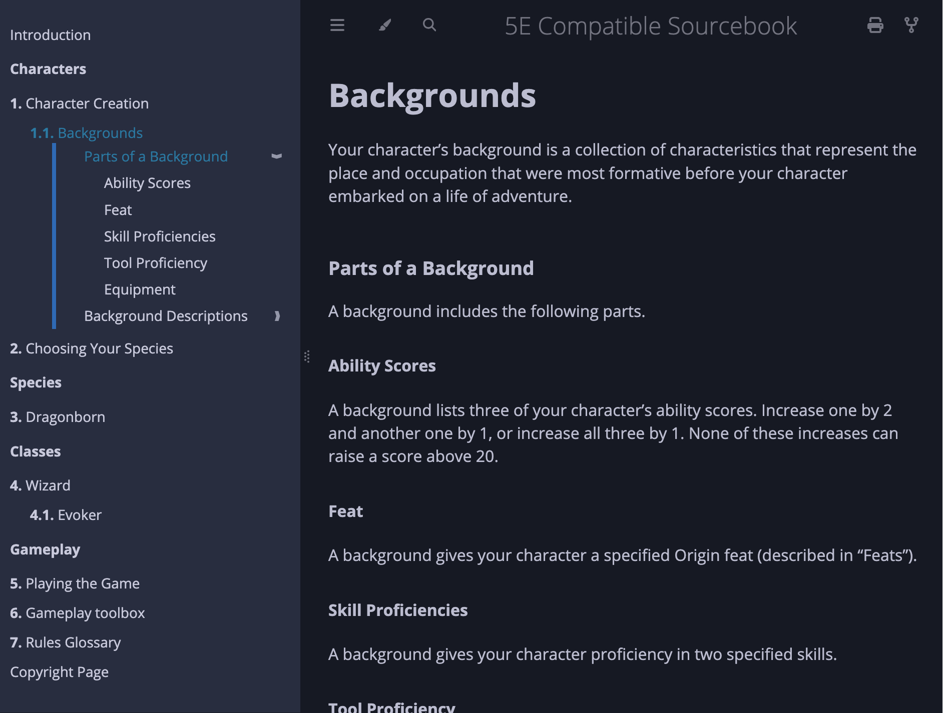 Included are a bunch of the bare bones basics taken from Markdown version of the SRD: character creation and gameplay guides along with example species, class, and subclass. Although this is mostly just to give a sense of what you can do and good practice, I highly recommend keeping the guides and contributed to the project I copied them from.